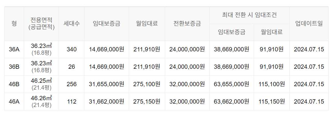 임대보증금 및 월 임대료는 입주자 모집공고일 기준이며, 보증금 최대 전환 시 변동될 수 있습니다.
