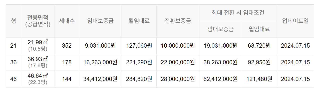 임대보증금 및 월 임대료는 입주자 모집공고일 기준이며, 보증금 최대 전환 시 변동될 수 있습니다.