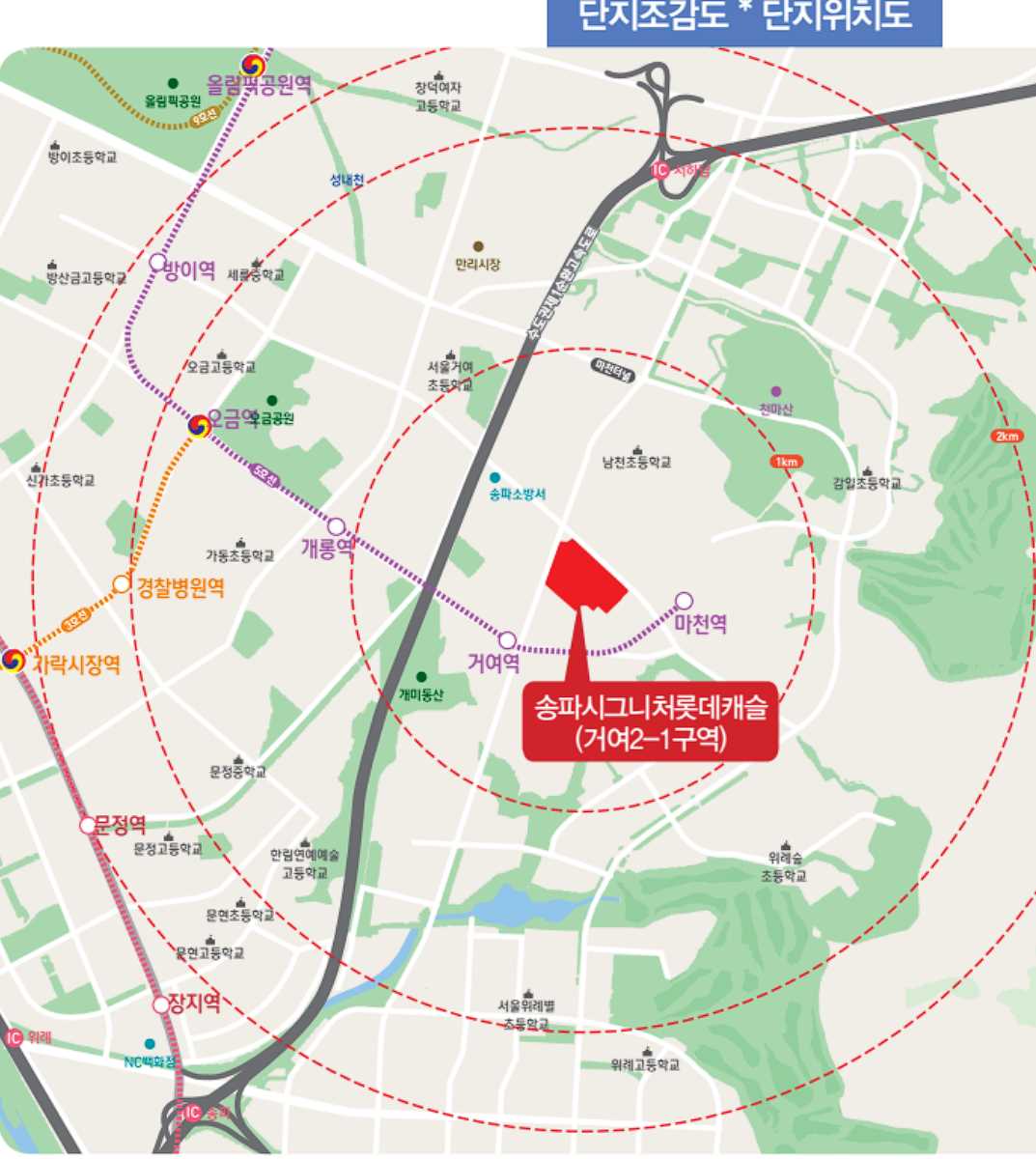 송파시그니처롯데캐슬는 서울 송파구 거여역, 마천역 근처에 위치하고 있습니다.