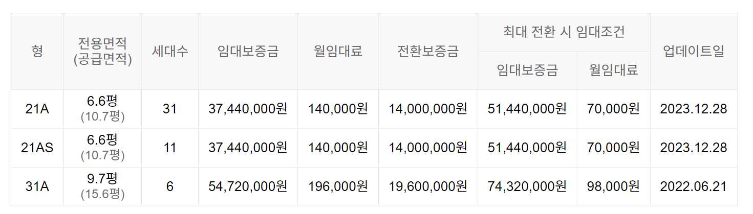 임대보증금 및 월 임대료는 입주자 모집공고일 기준이며, 보증금 최대 전환 시 변동될 수 있습니다.