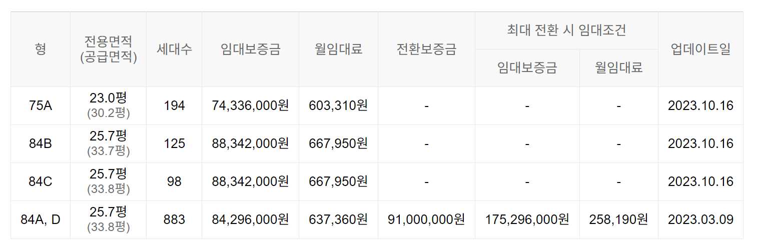 임대보증금 및 월 임대료는 입주자 모집공고일 기준이며, 보증금 최대 전환 시 변동될 수 있습니다.