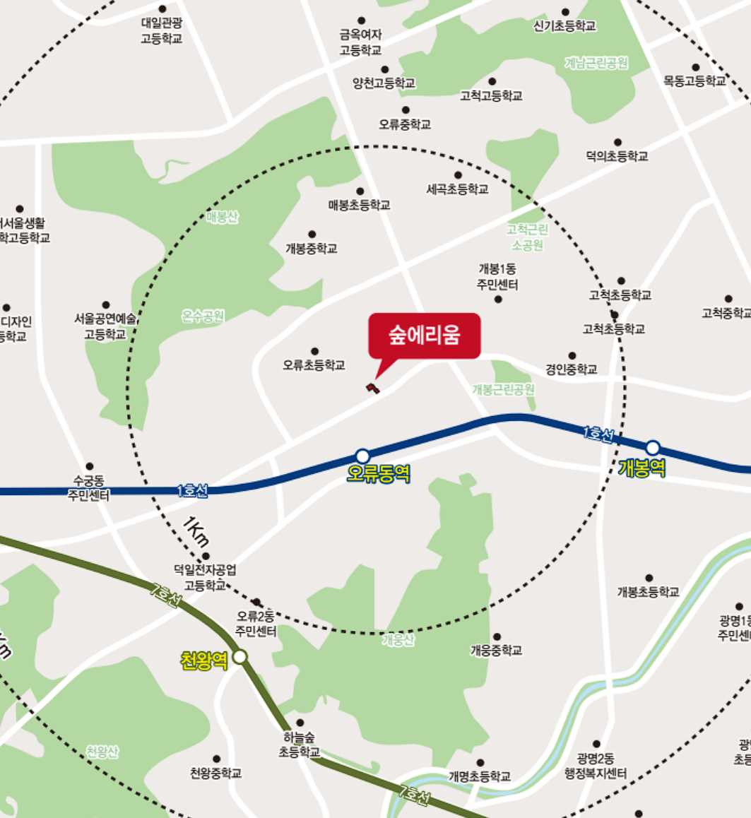 숲에리움는 서울 구로구 오류동역, 매봉산 근처에 위치하고 있습니다.
