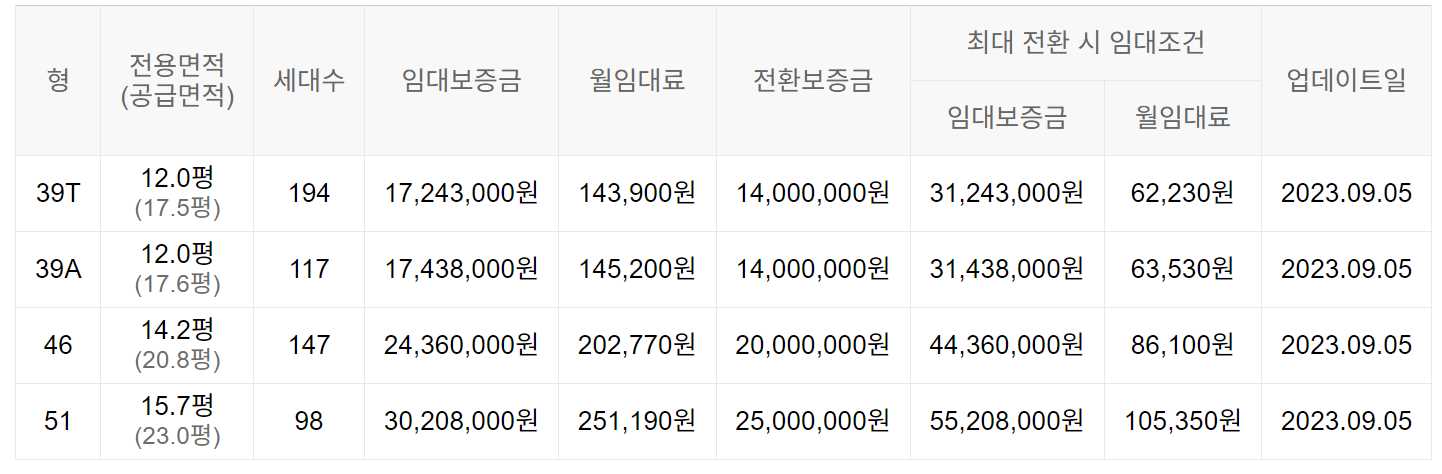 임대보증금 및 월 임대료는 입주자 모집공고일 기준이며, 보증금 최대 전환 시 변동될 수 있습니다.