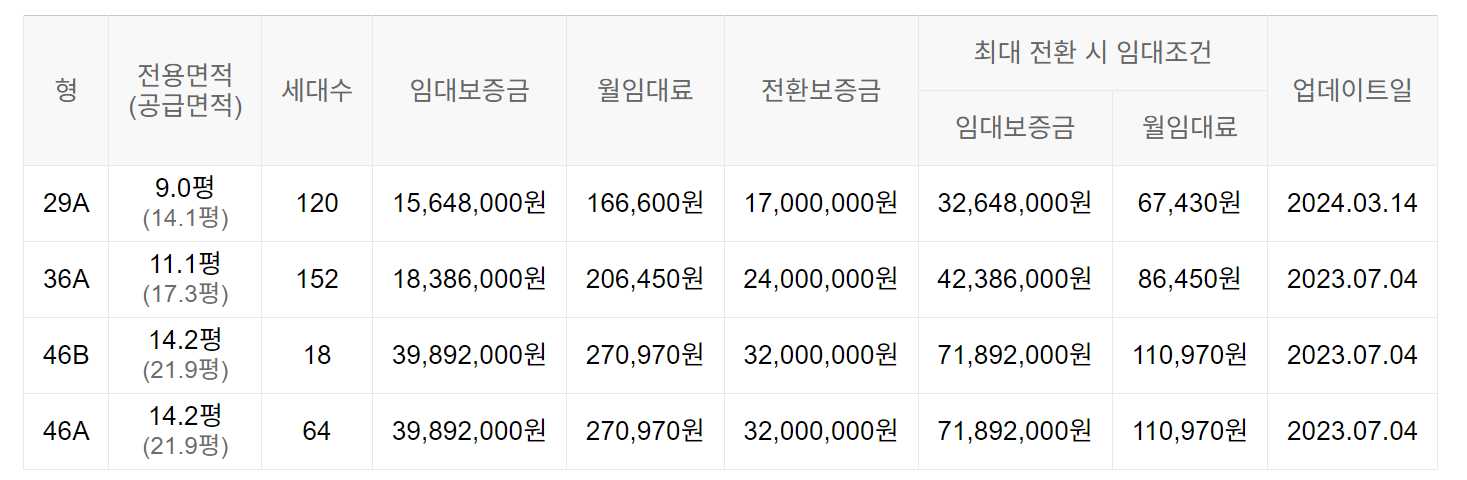 임대보증금 및 월 임대료는 입주자 모집공고일 기준이며, 보증금 최대 전환 시 변동될 수 있습니다.