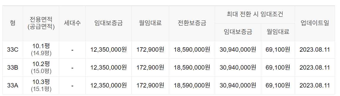 임대보증금 및 월 임대료는 입주자 모집공고일 기준이며, 보증금 최대 전환 시 변동될 수 있습니다.