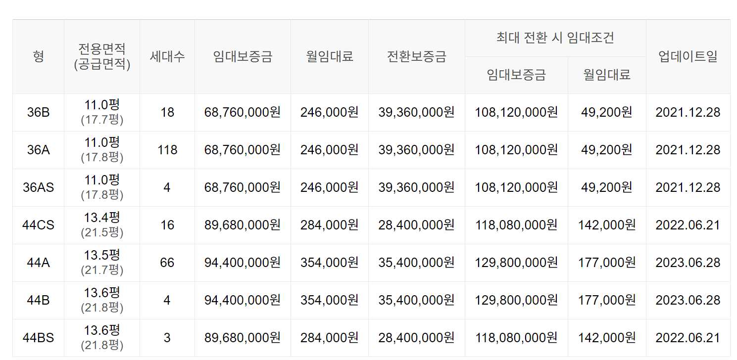 임대보증금 및 월 임대료는 입주자 모집공고일 기준이며, 보증금 최대 전환 시 변동될 수 있습니다.