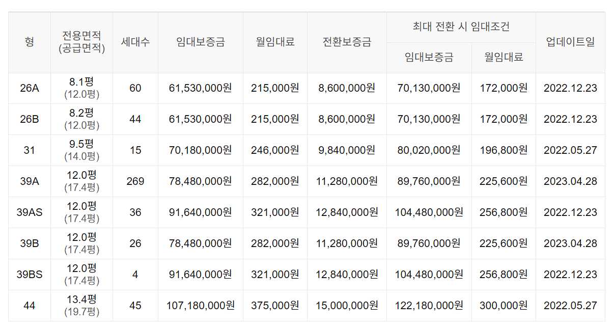 임대보증금 및 월 임대료는 입주자 모집공고일 기준이며, 보증금 최대 전환 시 변동될 수 있습니다.
