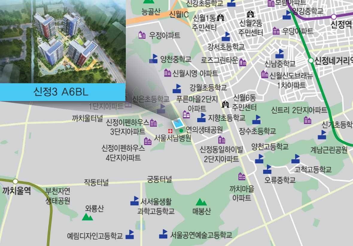신정이든채행복주택는 서울 양천구 서울서남병원, 온수도시자연공원 근처에 위치하고 있습니다.