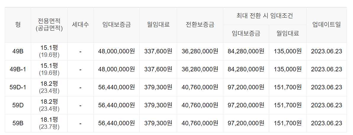 임대보증금 및 월 임대료는 입주자 모집공고일 기준이며, 보증금 최대 전환 시 변동될 수 있습니다.