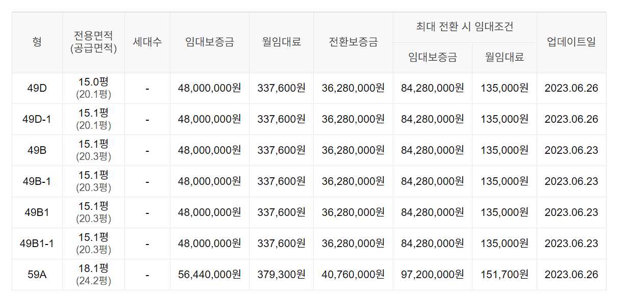 임대보증금 및 월 임대료는 입주자 모집공고일 기준이며, 보증금 최대 전환 시 변동될 수 있습니다.
