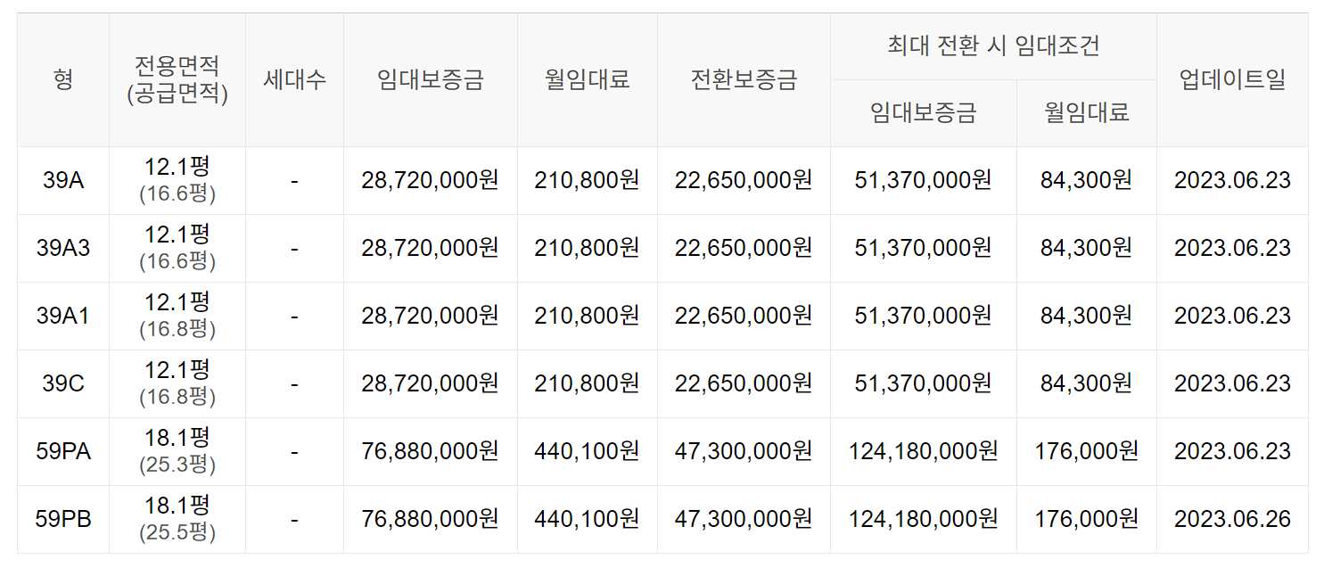 임대보증금 및 월 임대료는 입주자 모집공고일 기준이며, 보증금 최대 전환 시 변동될 수 있습니다.