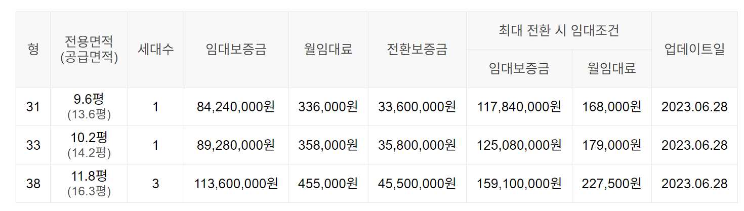 임대보증금 및 월 임대료는 입주자 모집공고일 기준이며, 보증금 최대 전환 시 변동될 수 있습니다.