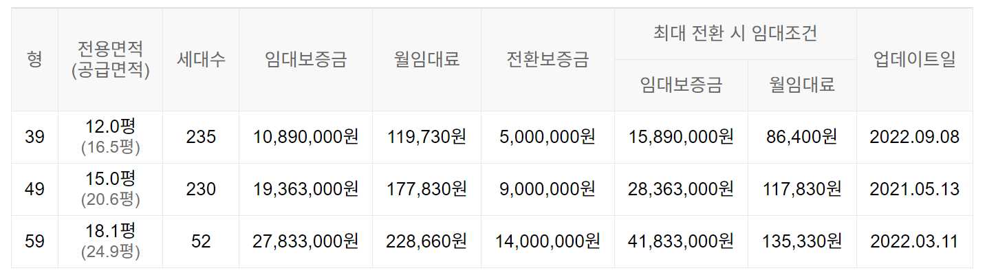 임대보증금 및 월 임대료는 입주자 모집공고일 기준이며, 보증금 최대 전환 시 변동될 수 있습니다.