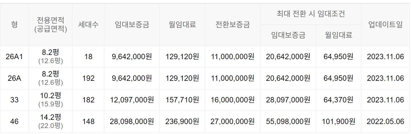 임대보증금 및 월 임대료는 입주자 모집공고일 기준이며, 보증금 최대 전환 시 변동될 수 있습니다.