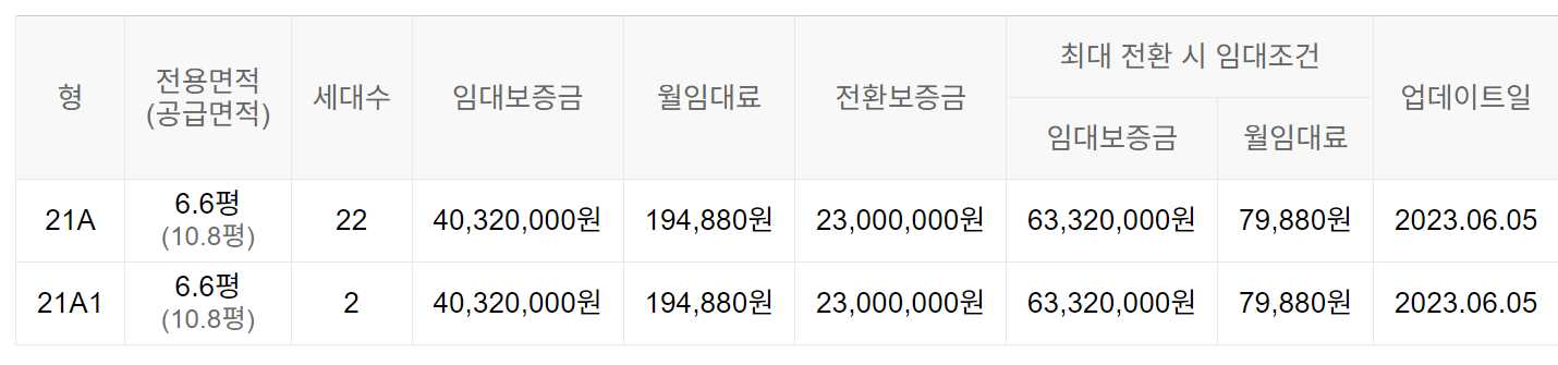 임대보증금 및 월 임대료는 입주자 모집공고일 기준이며, 보증금 최대 전환 시 변동될 수 있습니다.