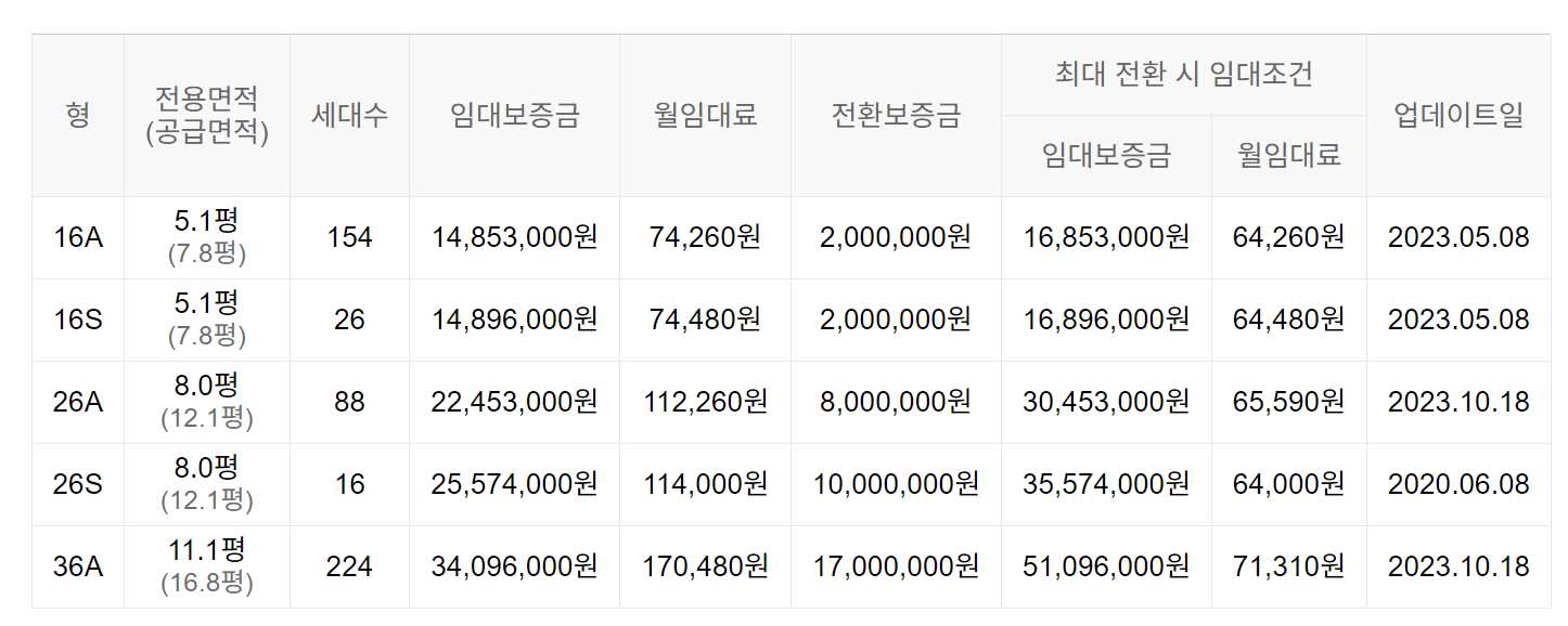 임대보증금 및 월 임대료는 입주자 모집공고일 기준이며, 보증금 최대 전환 시 변동될 수 있습니다.