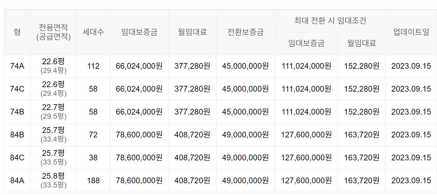 임대보증금 및 월 임대료는 입주자 모집공고일 기준이며, 보증금 최대 전환 시 변동될 수 있습니다.