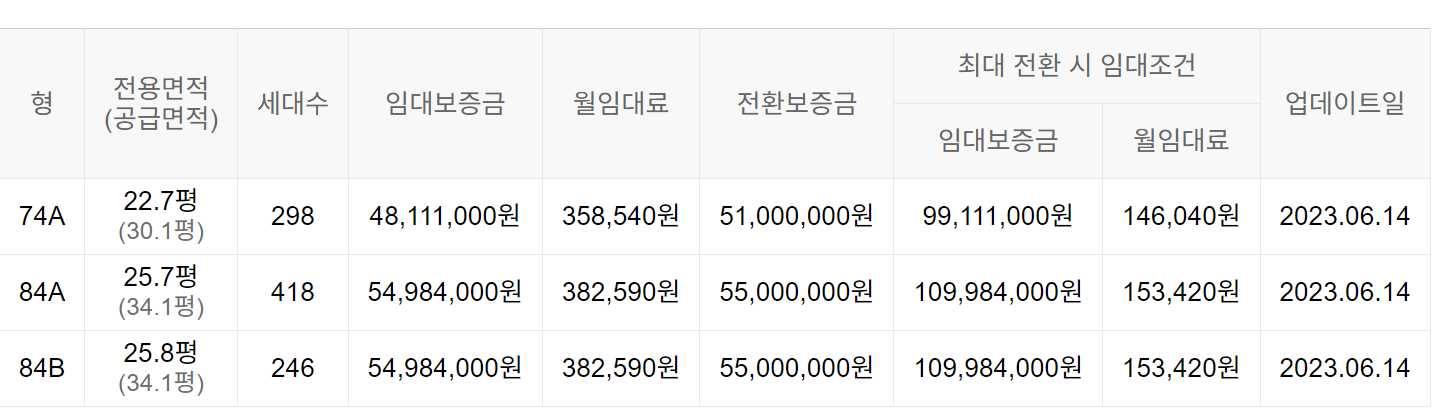 임대보증금 및 월 임대료는 입주자 모집공고일 기준이며, 보증금 최대 전환 시 변동될 수 있습니다.