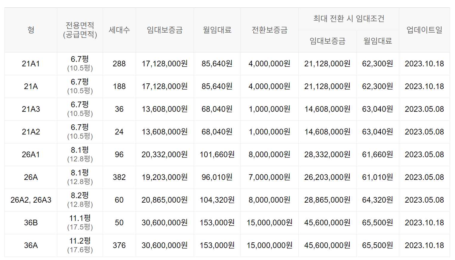 임대보증금 및 월 임대료는 입주자 모집공고일 기준이며, 보증금 최대 전환 시 변동될 수 있습니다.