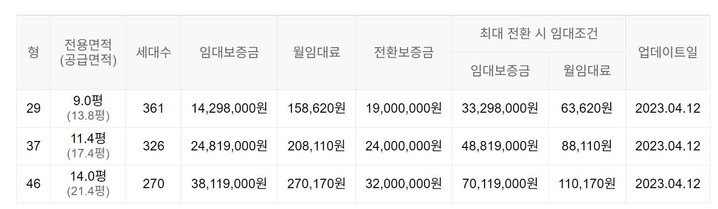 임대보증금 및 월 임대료는 입주자 모집공고일 기준이며, 보증금 최대 전환 시 변동될 수 있습니다.