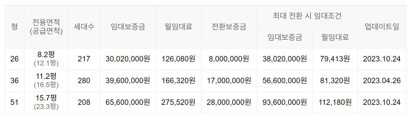 임대보증금 및 월 임대료는 입주자 모집공고일 기준이며, 보증금 최대 전환 시 변동될 수 있습니다.