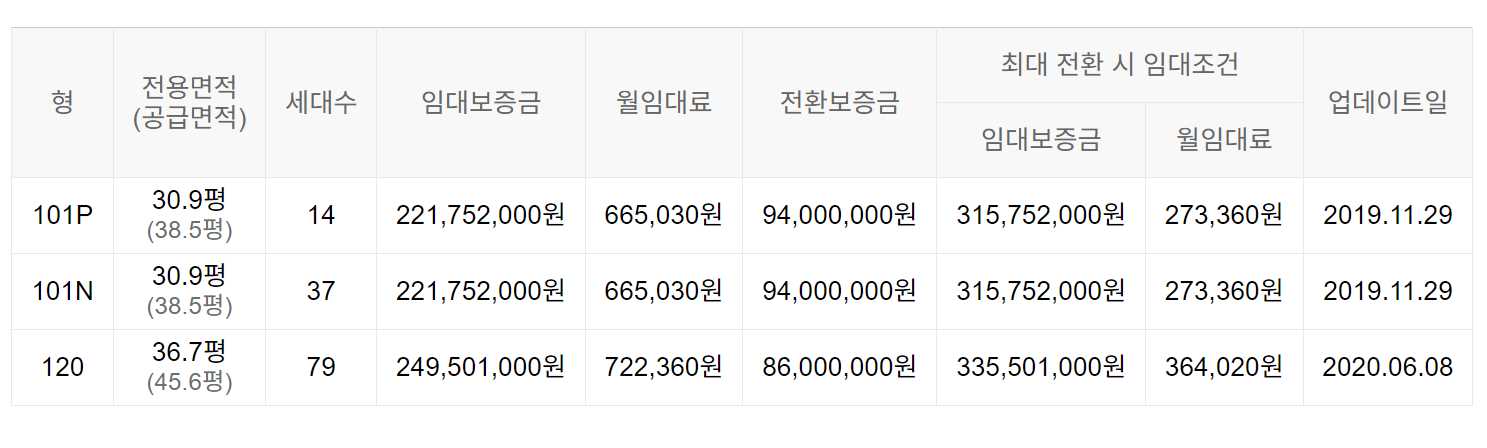 임대보증금 및 월 임대료는 입주자 모집공고일 기준이며, 보증금 최대 전환 시 변동될 수 있습니다.