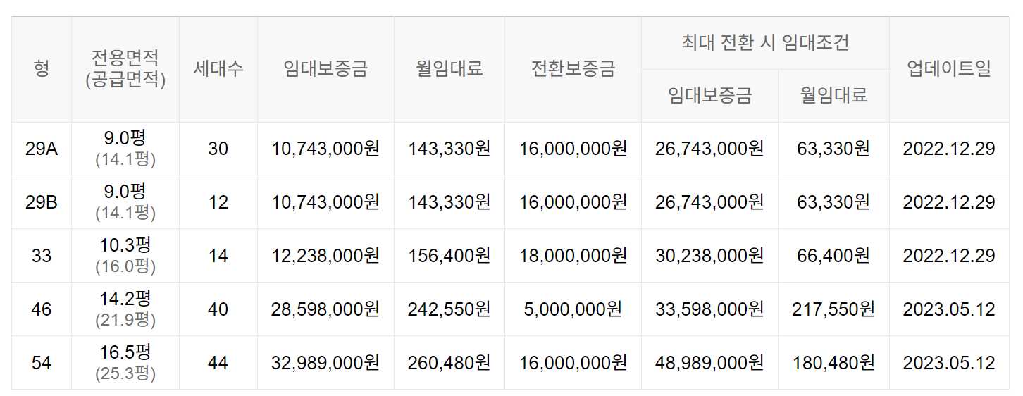 임대보증금 및 월 임대료는 입주자 모집공고일 기준이며, 보증금 최대 전환 시 변동될 수 있습니다.