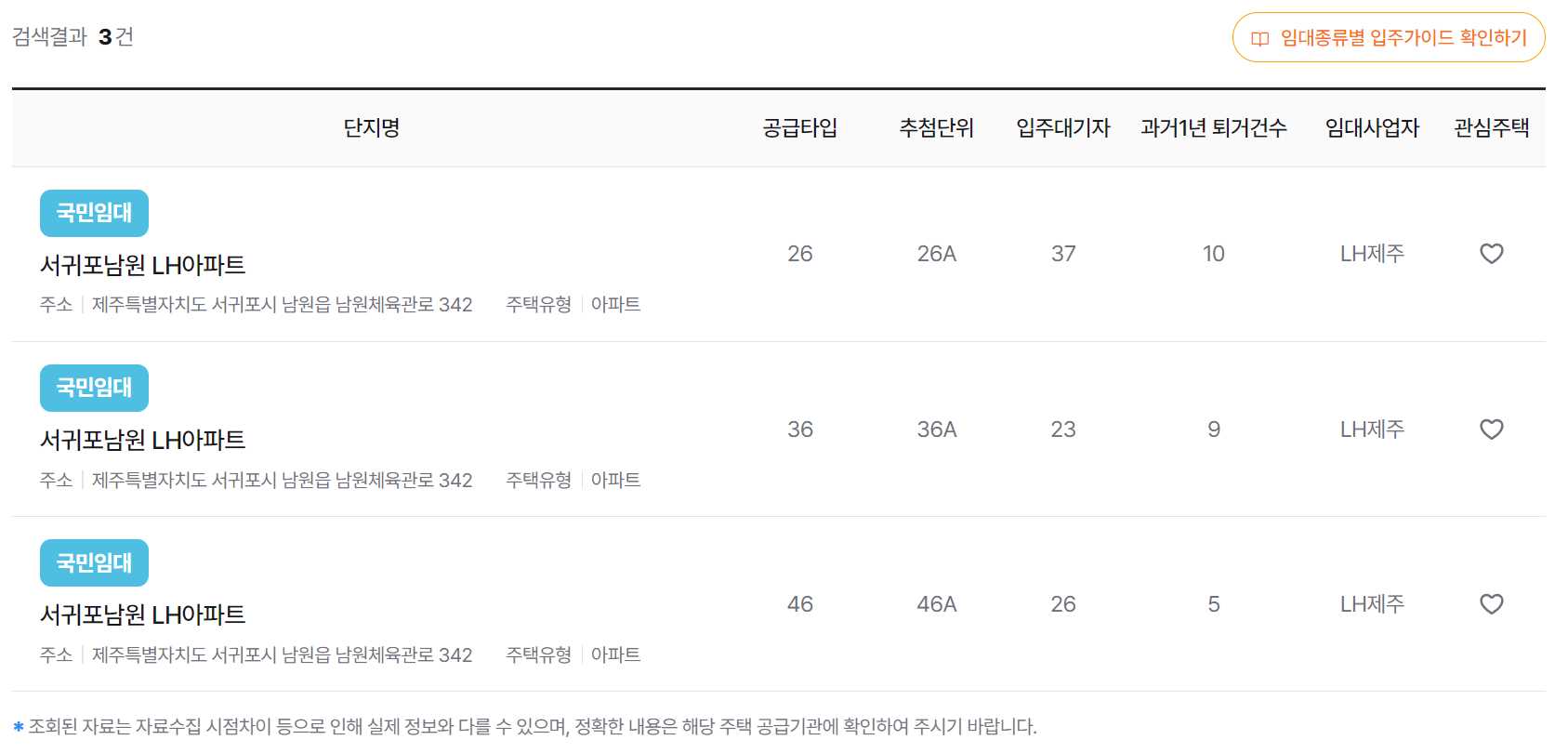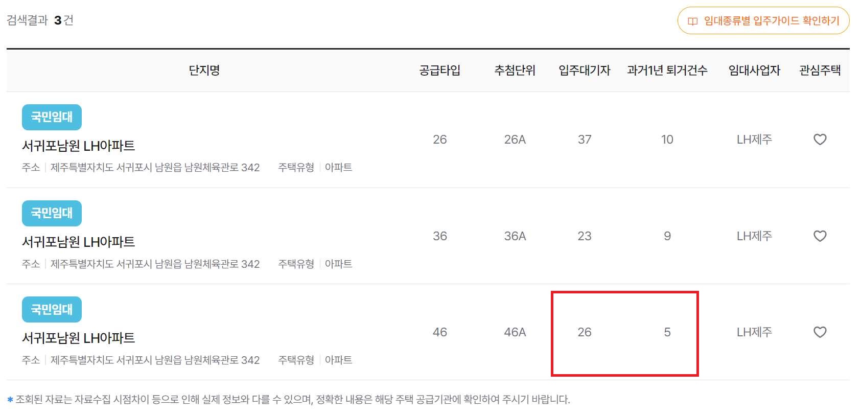 서귀포남원 LH아파트 46A 기준, 현재 입주 대기자수는 26명이고, 그중에 제 순번은 10번이 되는 겁니다.