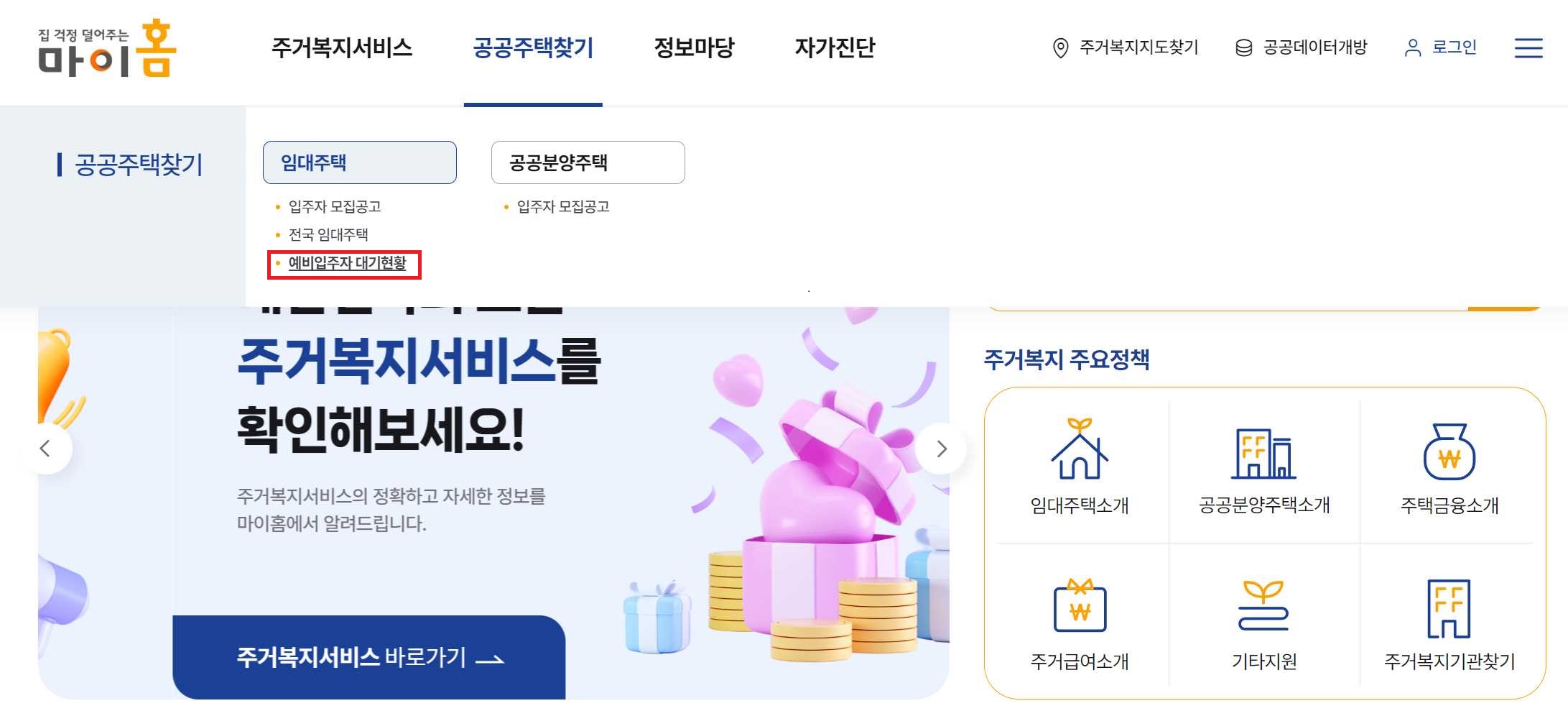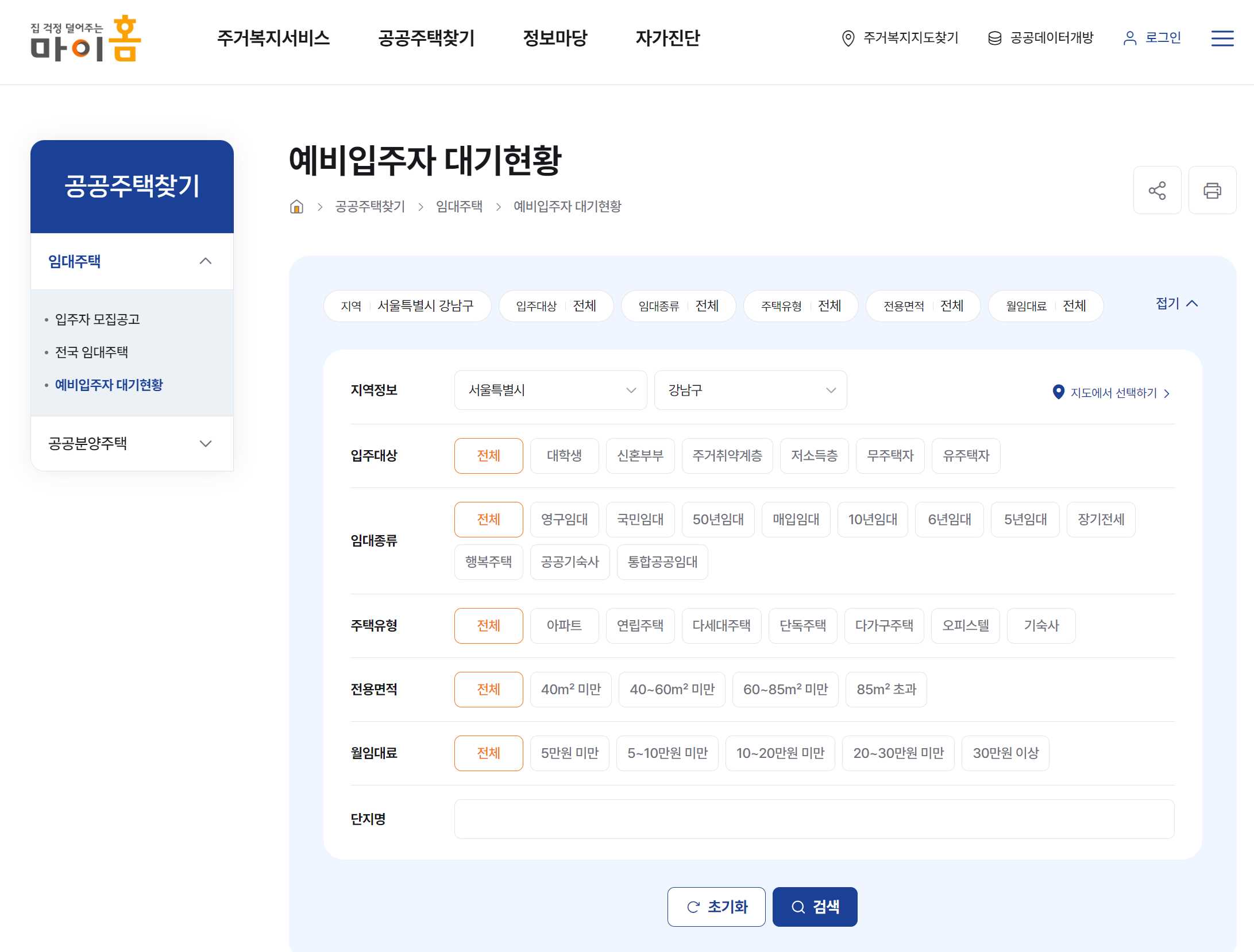 예비입주자 대기현황 조회 방법은 마이홈 홈페이지에서 조회가 가능합니다.