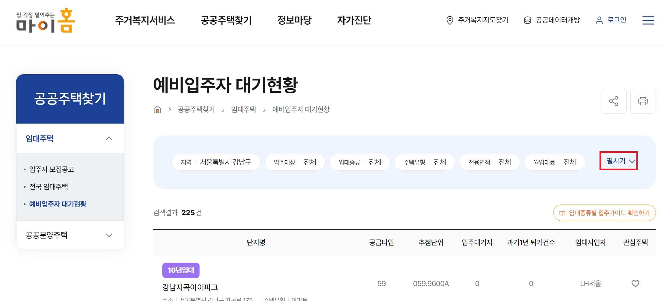 펼치기를 눌러서 원하는 단지명을 입력 후에 검색하기를 눌러줍니다. 특정 지역이나 임대종류, 주택유형, 전용면적, 월임대료 등을 기준을 조회하고 싶다면 그렇게 설정 후 진행하시면 됩니다.