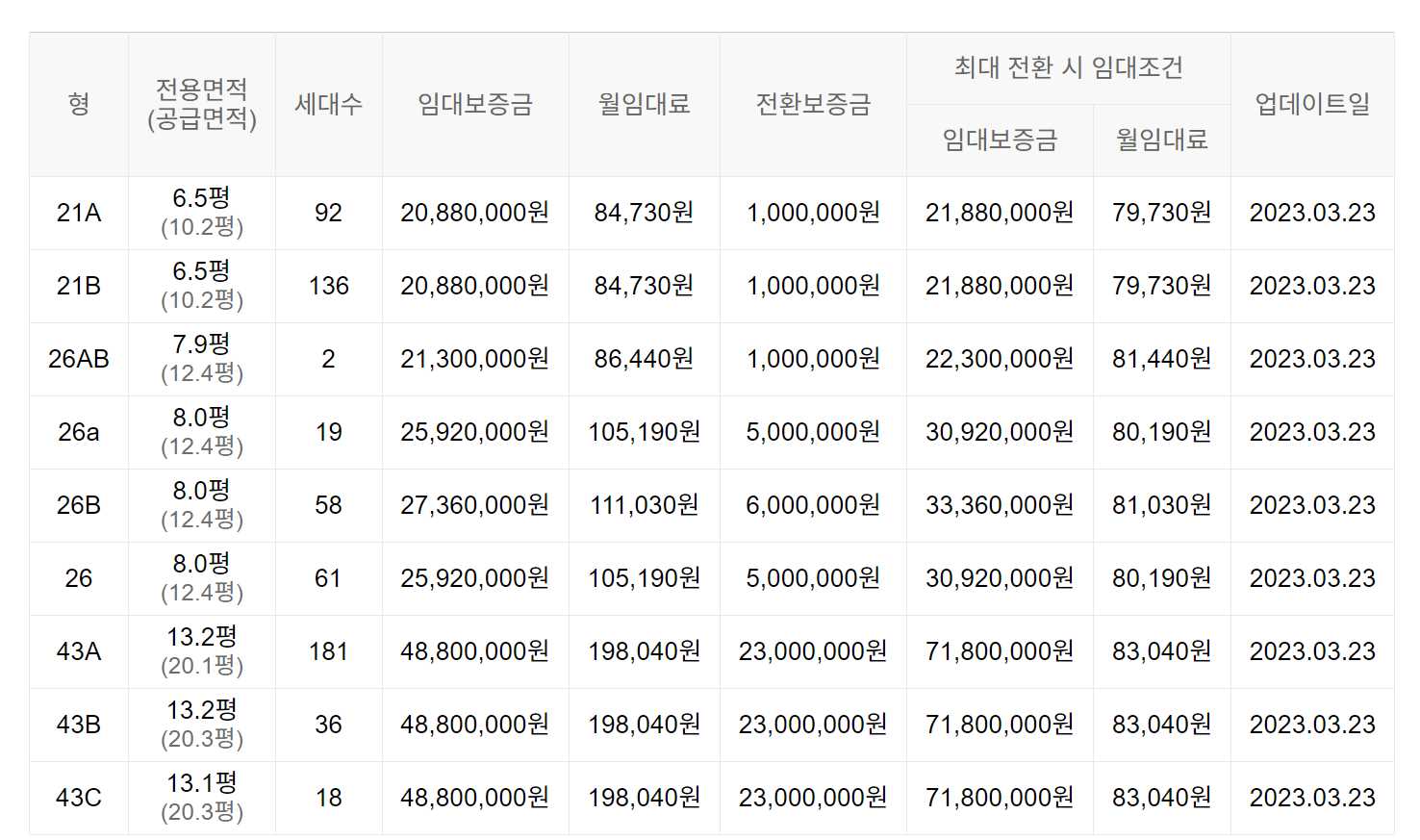 임대보증금 및 월 임대료는 입주자 모집공고일 기준이며, 보증금 최대 전환 시 변동될 수 있습니다.