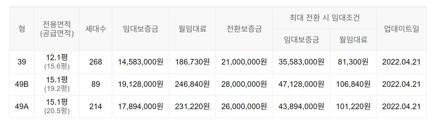 임대보증금 및 월 임대료는 입주자 모집공고일 기준이며, 보증금 최대 전환 시 변동될 수 있습니다.