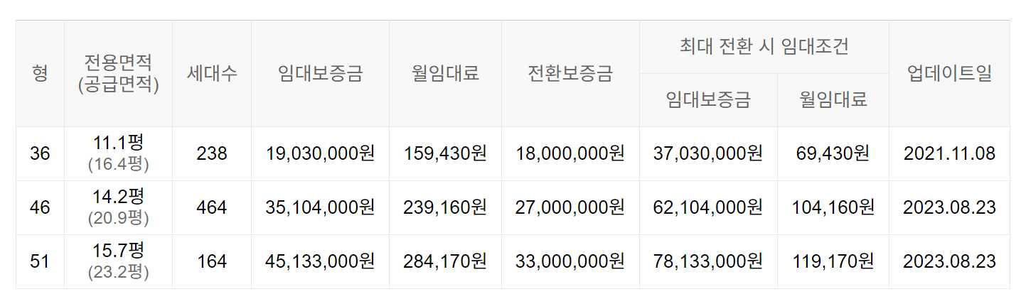 임대보증금 및 월 임대료는 입주자 모집공고일 기준이며, 보증금 최대 전환 시 변동될 수 있습니다.