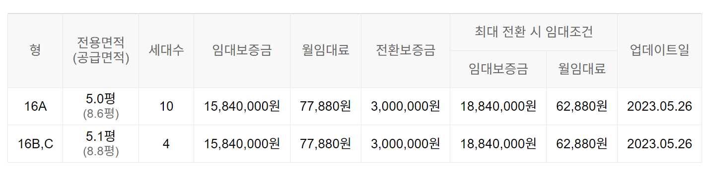 임대보증금 및 월 임대료는 입주자 모집공고일 기준이며, 보증금 최대 전환 시 변동될 수 있습니다.