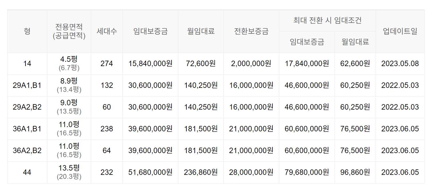 임대보증금 및 월 임대료는 입주자 모집공고일 기준이며, 보증금 최대 전환 시 변동될 수 있습니다.