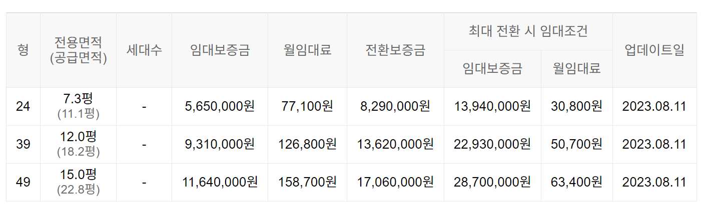 임대보증금 및 월 임대료는 입주자 모집공고일 기준이며, 보증금 최대 전환 시 변동될 수 있습니다.