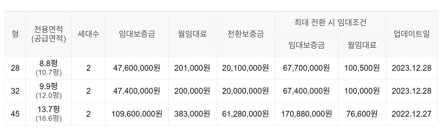 임대보증금 및 월 임대료는 입주자 모집공고일 기준이며, 보증금 최대 전환 시 변동될 수 있습니다.