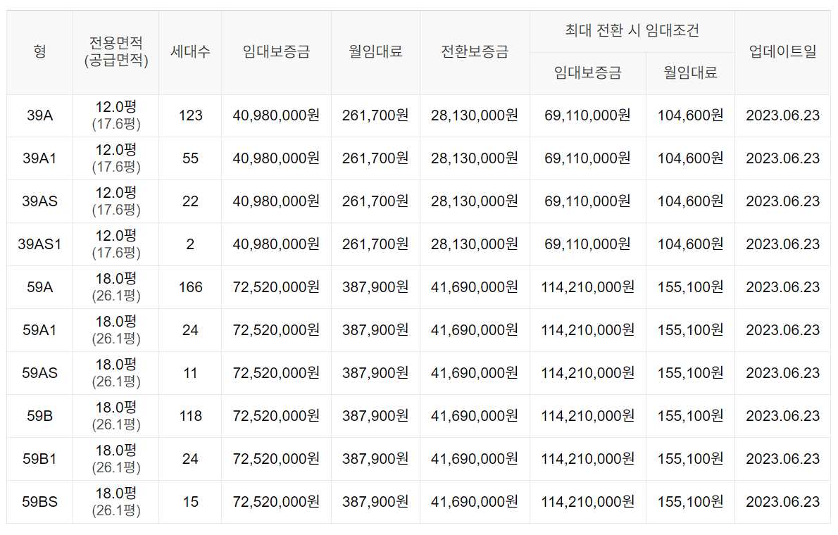 임대보증금 및 월 임대료는 입주자 모집공고일 기준이며, 보증금 최대 전환 시 변동될 수 있습니다.