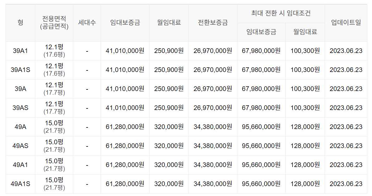 임대보증금 및 월 임대료는 입주자 모집공고일 기준이며, 보증금 최대 전환 시 변동될 수 있습니다.