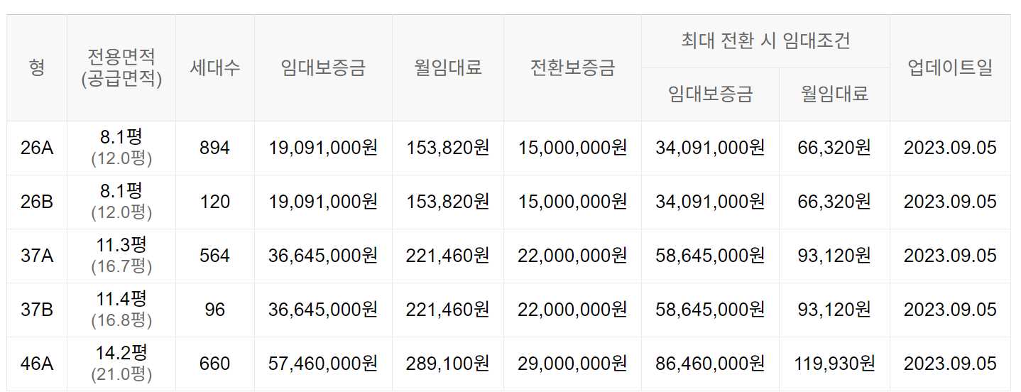 임대보증금 및 월 임대료는 입주자 모집공고일 기준이며, 보증금 최대 전환 시 변동될 수 있습니다.
