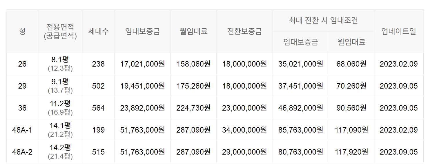 임대보증금 및 월 임대료는 입주자 모집공고일 기준이며, 보증금 최대 전환 시 변동될 수 있습니다.