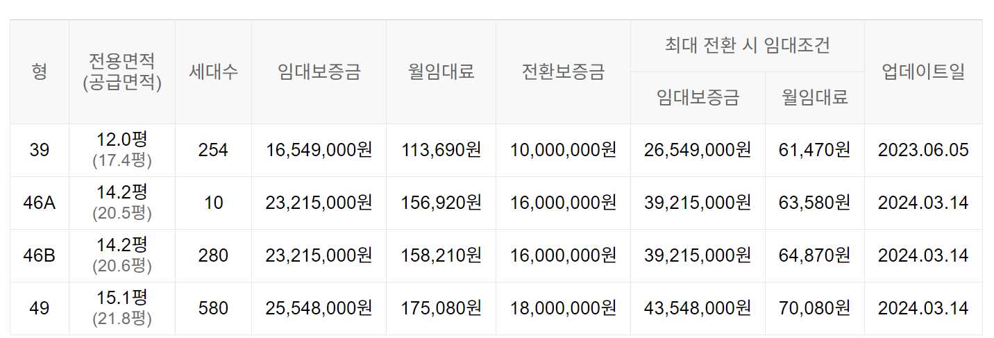 임대보증금 및 월 임대료는 입주자 모집공고일 기준이며, 보증금 최대 전환 시 변동될 수 있습니다.