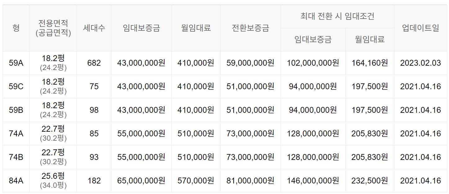 임대보증금 및 월 임대료는 입주자 모집공고일 기준이며, 보증금 최대 전환 시 변동될 수 있습니다.