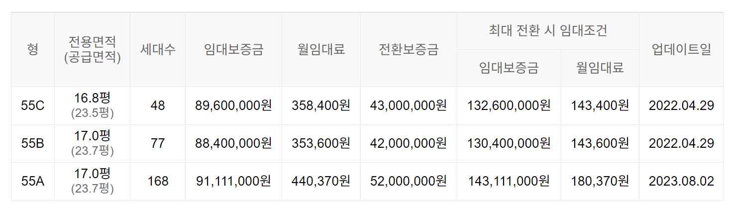 임대보증금 및 월 임대료는 입주자 모집공고일 기준이며, 보증금 최대 전환 시 변동될 수 있습니다.
