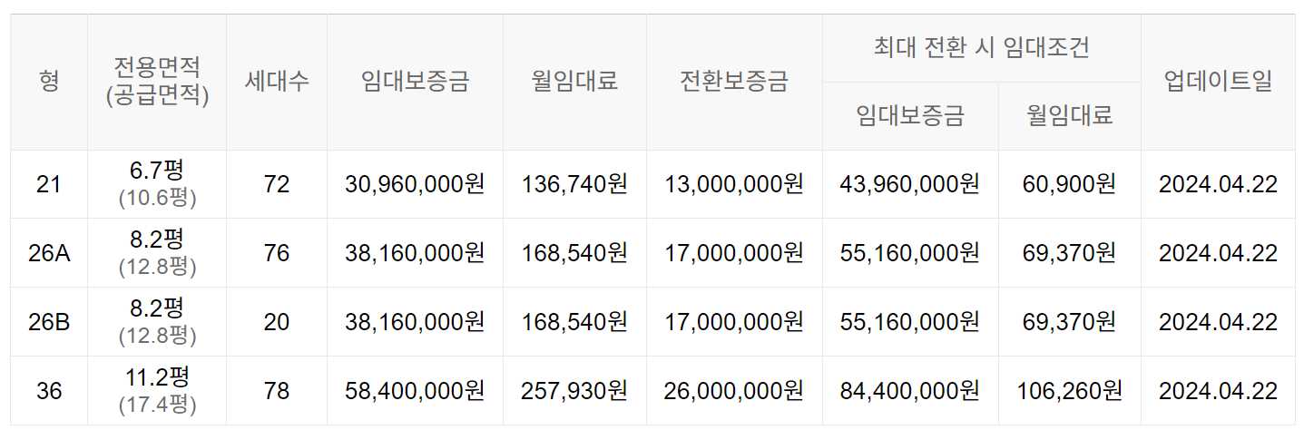 임대보증금 및 월 임대료는 입주자 모집공고일 기준이며, 보증금 최대 전환 시 변동될 수 있습니다.