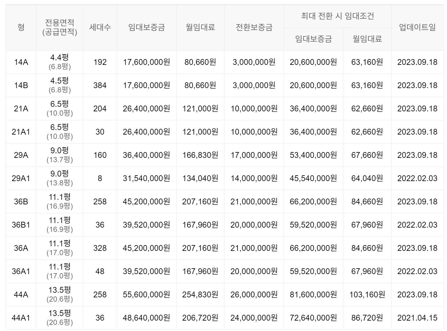임대보증금 및 월 임대료는 입주자 모집공고일 기준이며, 보증금 최대 전환 시 변동될 수 있습니다.