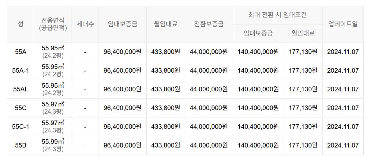 임대보증금 및 월 임대료는 입주자 모집공고일 기준이며, 보증금 최대 전환 시 변동될 수 있습니다.