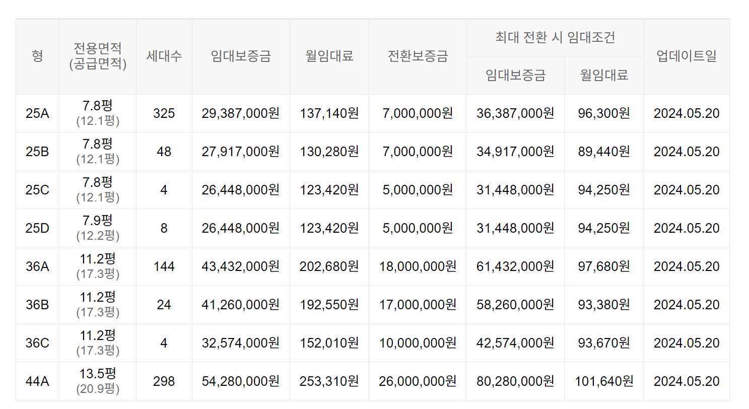 임대보증금 및 월 임대료는 입주자 모집공고일 기준이며, 보증금 최대 전환 시 변동될 수 있습니다.