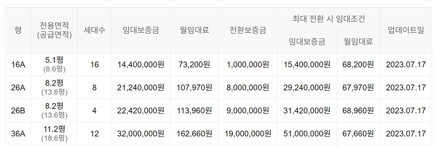 임대보증금 및 월 임대료는 입주자 모집공고일 기준이며, 보증금 최대 전환 시 변동될 수 있습니다.