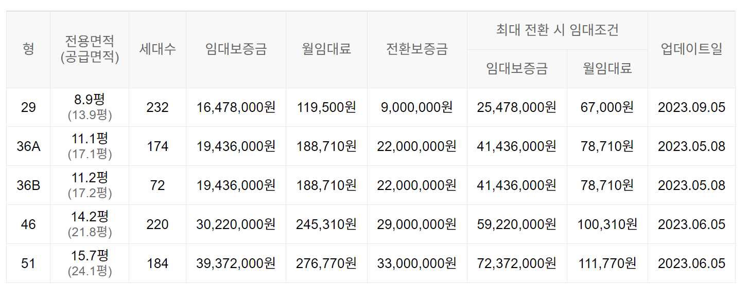 임대보증금 및 월 임대료는 입주자 모집공고일 기준이며, 보증금 최대 전환 시 변동될 수 있습니다.